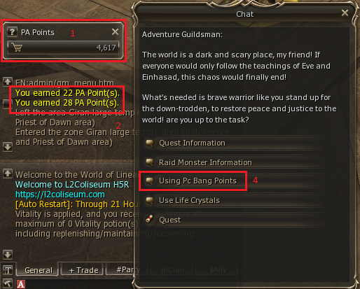 Image Details: 1 - PA Counter / Contador de PA. 2 - PA Adquire / Adquisicion de PA. 3 - Aventure Guildsman / Aventure Guldsman. 4 - Menu of PA Exchange / Menu Para intercambiar tus PA. |